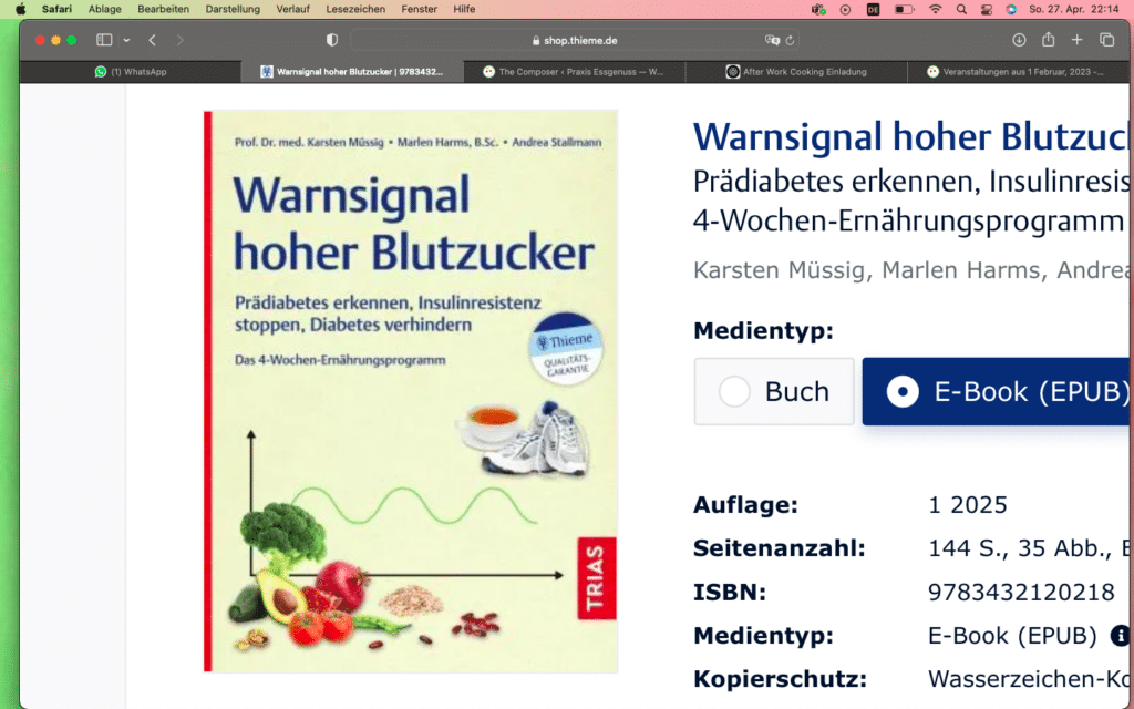 In diesem beson­deren Kochwork­shop geben wir eine prak­tis­che Ein­führung in unser neues Buch „Warnsignal hoher Blutzuck­er – Prä­di­a­betes erken­nen, Insulin­re­sistenz stop­pen, Dia­betes ver­hin­dern. Das 4‑Wochen-Ernährung­spro­gramm“.